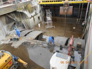 Nachdem im vergangenen Jahr der erste Bauabschnitt der Sanierung des Wehres Würzburg mit der Erneuerung der Revisionverschlüsse abgeschlossen wurde, steht nun bei den Arbeiten im Jahr 2016 der Ausbau und die Erneuerung des Wehrverschlusses an. Es wurde im OW die Baugrubenabdichtung mittels Spundwänden hergestellt. Der alte Wehrverschluss wurde in insgesamt 6 Stücke geteilt, so dass diese mit einem Sennebogen ausgehoben und verschifft werden konnten.