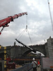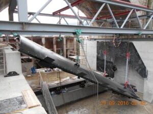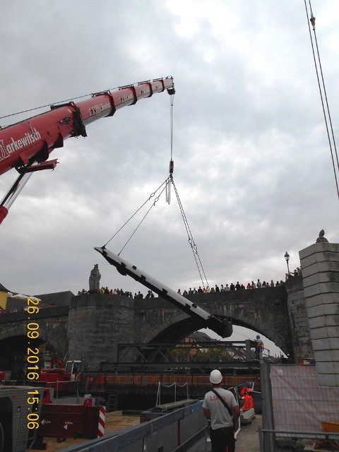 Die neue Klappe für das rechte Wehr in Würzburg wurde am Montag, den 26.09.2016 mittels Schiff (Schubboot mit Schubleichter L=65m, B=9,5m) von der Liegestelle Heidingsfeld zum Einbauort an die Alte Mainbrücke transportiert. Anschließend wurde die 15 Tonnen schwere Klappe mit einem 200 Tonnen Mobilkran in die Baugrube gehoben und von dort in Maßarbeit mit einer Verschubbahn an Ihren Bestimmungsort unter die Alte Mainbrücke geschoben und eingebaut.