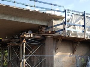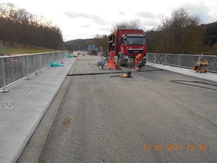 Seit Ende Juni wurde die Brücke instandgesetzt. Hierbei wurde der Asphalt auf der Brücke abgefräst und die beidseitigen Kappen mit einer Länge von je 33 m abgebrochen. Anschließend wurde der Überbau mit einem Gewicht von rund 250 Tonnen mittels hydraulischen Pressen 1,20 m angehoben, um auch die Auflagerbereiche Instand setzten zu können. Nach Absenken des Überbaus wurde eine neue Abdichtung auf das Bauwerk aufgebracht und die beidseitigen Kappen wieder hergestellt.
