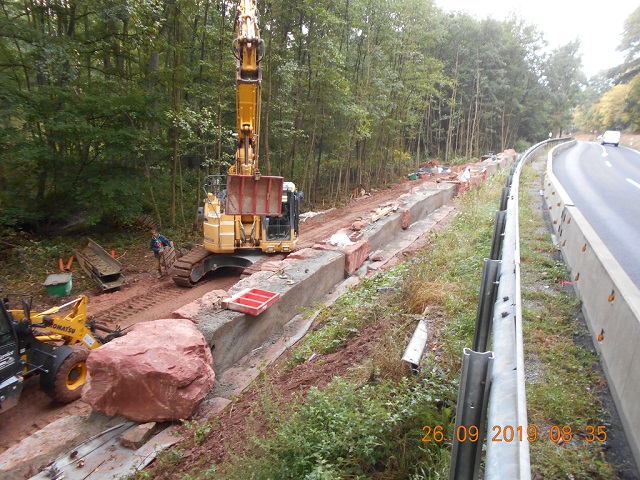Im Auftrag des Staatlichen Bauamtes Aschaffenburg wurde von August bis Dezember 2019 an der Staatsstraße 2308, zwischen Sommerau und Hobbach, eine Stützwand errichtet. Die Natursteinmauer aus Kalksandstein wurde auf einem vorher gegossenen, an den Straßenverlauf angepassten Fundament erstellt. Der Hang wurde abschließend angeböscht, angesät und bepflanzt. Die Stützmauer erhielt ein...
