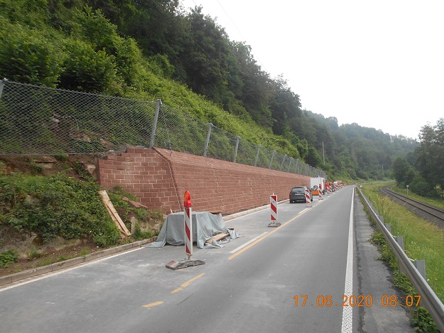 Die alte Stützmauer, bestehend aus einer Sandsteintrockenmauer, musste aufgrund der Standsicherheit erneuert werden. Der Rückbau der bestehenden Mauer musste abschnittsweise erfolgen, so dass nach einem Teilrückbau die 1. Schicht Spritzbeton als Hangsicherung aufgetragen werden konnte. Nach dem Auftrag der Hangsicherung wurden insgesamt 203 Verpressanker mit einer Länge von 3 –...